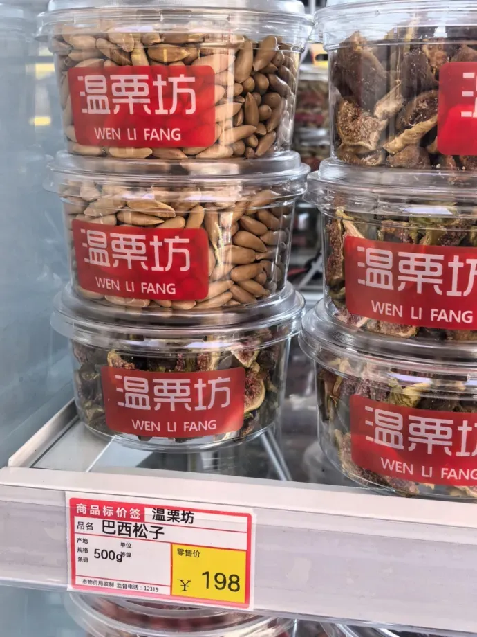 记者走访了呼和浩特多家商超与炒货店。在东万达的温栗坊与薛记炒货,巴西松子的标价均为198元/斤。