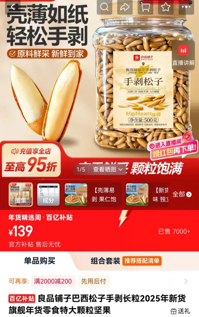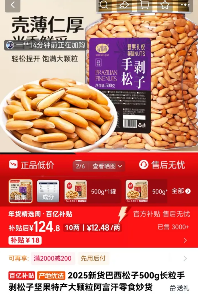 线下市场正在调整,而线上电商平台的冲击更为直接。记者在多个购物APP上看到,袋装巴西松子价格标注清晰,每斤售价在124元至176元区间,部分店铺的“年货节”价格甚至比线下店更具吸引力。这也让不少精打细算的市民将采购目光转向了网络。