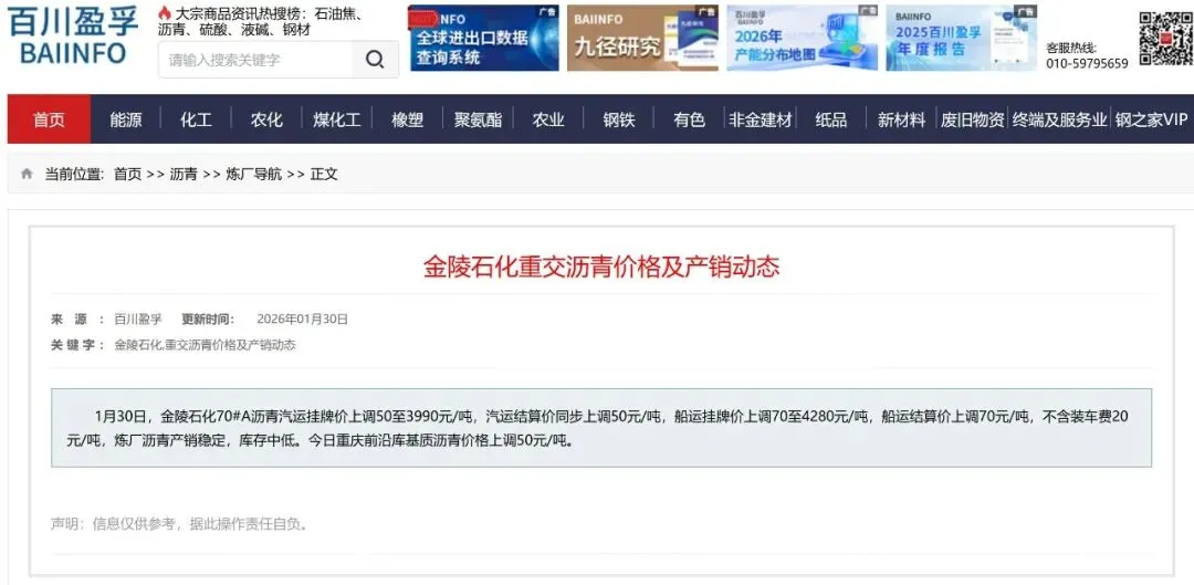 >2026年1月30日中石化道路沥青行情(汽运涨50,船运涨70)