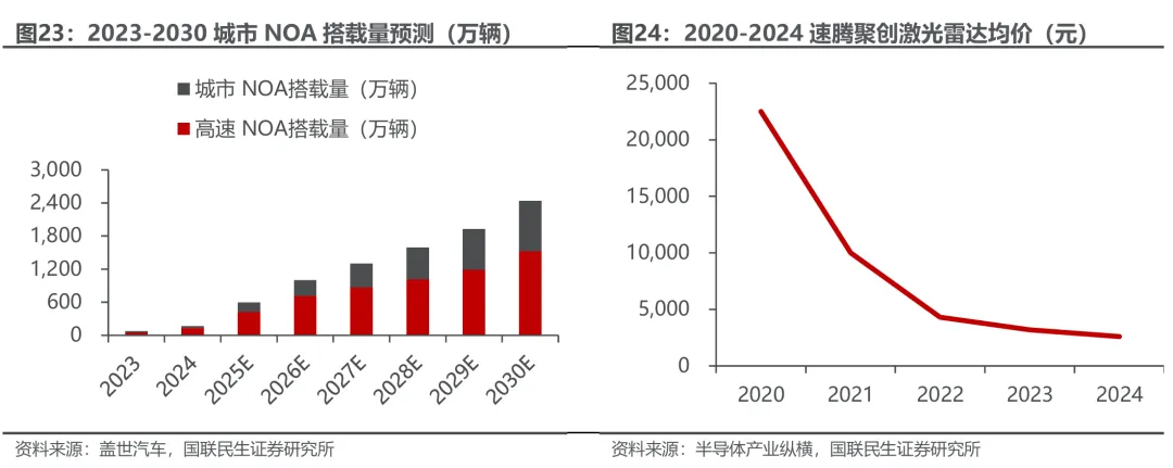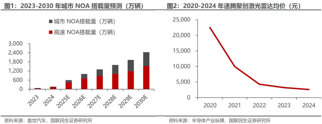 供给端:规模效应驱动,核心部件持续降本。随着市场对辅助驾驶功能的接受度不断提高,乘用车NOA(导航辅助驾驶)功能标配率快速提升,现已逐步下沉至10万元以下的中低端车型。预计到2030年,国内乘用车L2及以上智能驾驶功能标配渗透率将超过90%,NOA标配搭载量预计突破2,400万辆。该趋势推动智能驾驶产业链规模化发展,激光雷达、计算芯片等核心零部件技术持续迭代并实现量产,成本大幅下降。