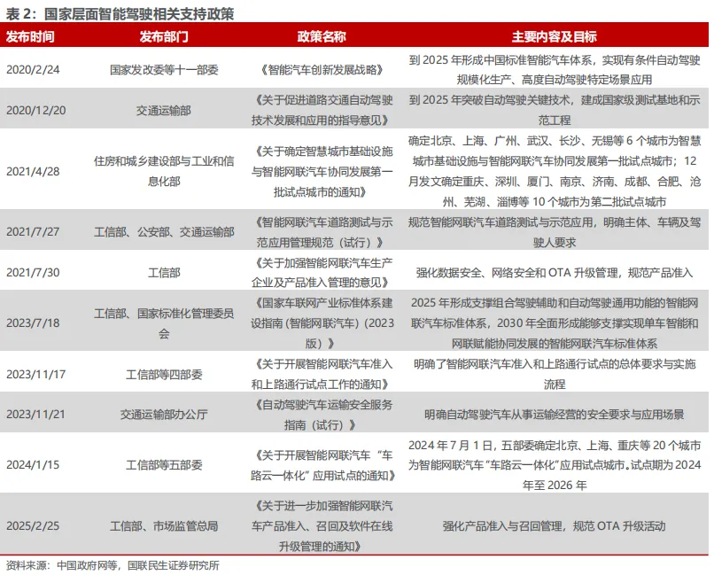 政策端:国家层面政策持续出台,支持智能网联汽车创新发展。2020年以来,国务院及各部委相继发布一系列政策文件,不仅为智能网联汽车的发展提供了制度保障,也为产业的规模化应用和商业化运营奠定了坚实基础。截至2025年9月,全国已建成17个国家级测试示范区,正加快推进20个“车路云一体化”试点城市建设,累计开放测试示范道路超3.2万公里、发放测试示范牌照超1万张。通过递进式政策引导,我国已形成完善的智能网联汽车政策支持体系,为产业高质量发展奠定制度基础。