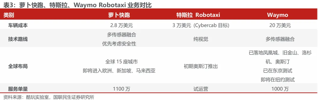 前装量产Robotaxi不断落地,以低硬件成本加速规模化应用。前装量产Robotaxi正成为行业加速商业化的核心驱动力,其通过硬件成本的大幅降低和标准化生产,推动Robotaxi从示范运营迈向规模化落地。