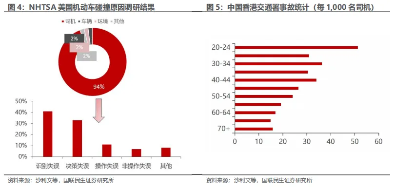 Robotaxi可以帮助规避由人为导致的大部分事故风险,保障驾驶员和乘客安全。根据NHTSA的研究显示,机动车碰撞事故中人为因素占比高达94%。香港运输署统计数据进一步显示,年轻司机由于操作熟练度不足、突发场景应对经验缺乏等原因,事故概率略高于其他群体,每1,000名持证司机发生51.3起意外。而Robotaxi 可以避免大多数人为因素导致的事故,减少交通事故发生率,保障驾乘人员的安全。一方面,通过预设的智能算法系统,自动驾驶完全规避人为驾驶中存在的各类主观风险因素,包括疲劳驾驶、酒驾以及交通违章等危险行为;另一方面,自动驾驶结合多种传感器和车路协同技术,能全面感知周边环境,提前发现并避免危险,减少事故发生的可能。