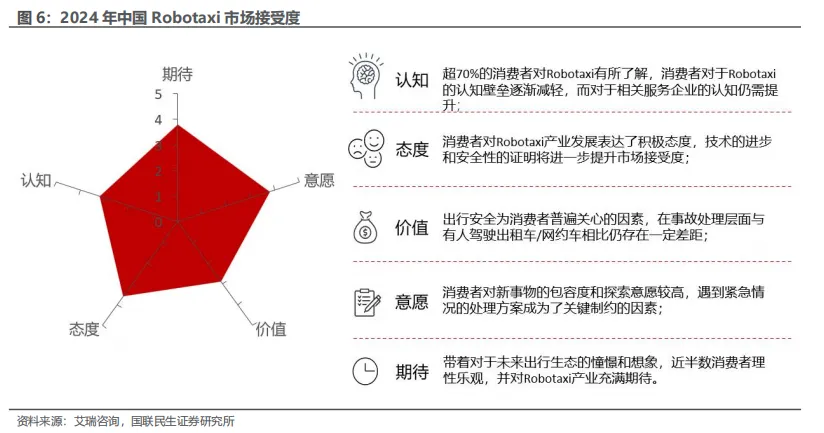 绝大多数消费者对Robotaxi持积极态度,70%有尝试意愿。市场整体呈现乐观态势,70%的受访者表示愿意尝试Robotaxi服务。根据艾瑞咨询,五大维度综合得分为3.46分,其中认知和价值层面得分相对落后,分别为3.2分和2.9分。一方面,消费者对技术原理和运营模式的了解仍显不足,这也影响着他们对于价值的判断;另一方面,作为新兴出行方式,Robotaxi仍需在技术可靠性验证和用户价值传递两个维度持续突破,加强市场教育,促进消费者的认知提升。