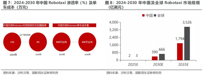 2030年Robotaxi市场规模有望达千亿级。当前市场仍处于培育期,2024年渗透率仅为1%,预计2030年增长至2%,Robotaxi未来市场发展前景广阔。市场规模方面,根据沙利文预计,全球Robotaxi市场预计将从2025年的3亿美元增长至2035年的3,526亿美元。中国市场Robotaxi的规模预计将从2025年的2亿美元增长至 2035年的1,794亿美元,展现出强劲的增长潜力,标志着Robotaxi正逐步成为未来出行市场的重要组成部分。