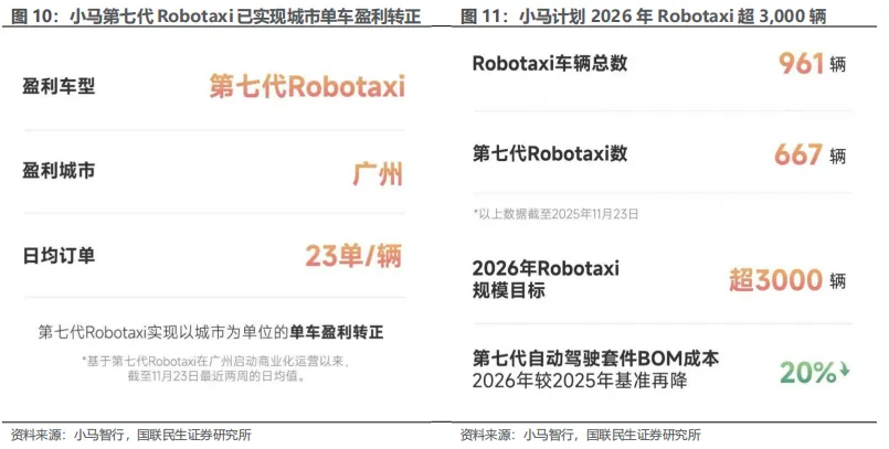 小马智行Robotaxi业务2025Q3收入同比+89.5%,加速驶向单车盈亏平衡。2025Q3,小马智行总营收达到1.81亿元人民币,同比增长72%,其中Robotaxi业务收入达4,770万元,同比增长高达89.5%,其中直接来自乘客支付的车费收入同比增长超200%,成为营收增长最核心的引擎。截至2025年11月23日,小马智行第七代Robotaxi已在广州实现城市级单车盈利转正,截至2025年12月31日Robotaxi车辆总数达1,159辆,计划2026年实现超3,000辆Robotaxi部署,2026年第七代自动驾驶套件BOM成本较2025年基准再降20%。