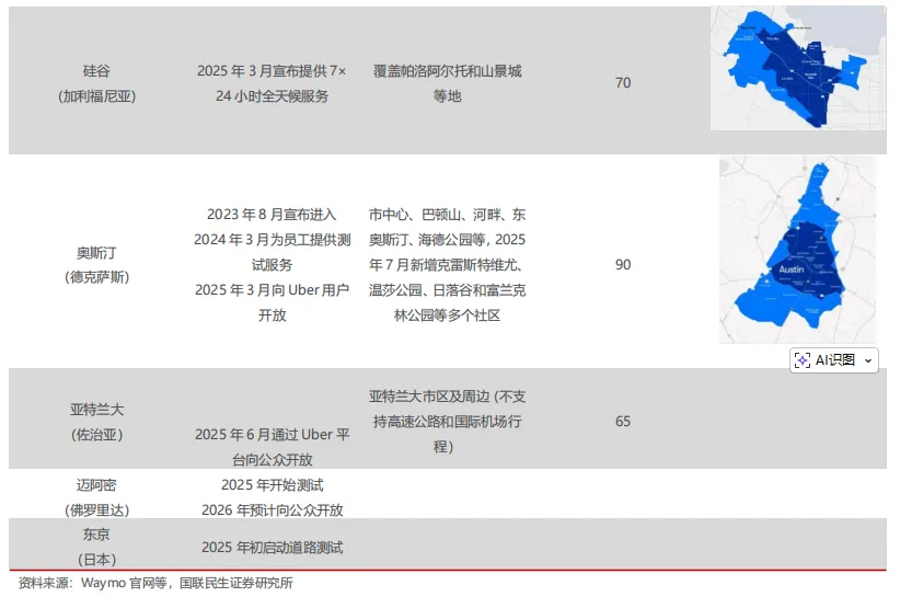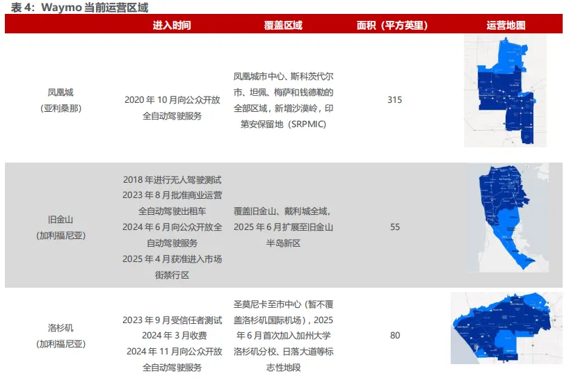 海外:Waymo运营范围不断拓展,当前已覆盖凤凰城、旧金山、洛杉矶、奥斯汀、亚特兰大等五座城市。其中,凤凰城为全球首个完全无人驾驶付费服务城市,已实现315平方英里的全自动驾驶服务覆盖;旧金山和洛杉矶陆续于2024年向公众开放服务,运营区域包括城市核心及周边社区;奥斯汀和亚特兰大已于2025年通过Uber平台向用户开放。目前Waymo正在迈阿密和东京积极推进测试布局。