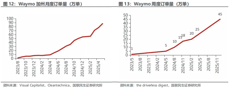 Waymo订单量增长迅猛,2026年车队数量计划增长至3,500台。根据VisualCapitalist,Waymo在加州的月度订单量呈现持续攀升态势,2024年4月起增速开始显著提升,2025Q2单月已突破80万单。从周度运营数据来看,Waymo周度订单量呈现先缓后陡的增长态势,根据the driverless digest数据,Waymo周度订单量已于2025年12月8日达到45万单。