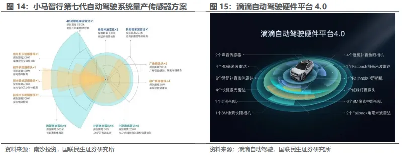 3)滴滴。2025年4月,滴滴自动驾驶与广汽埃安联合打造的L4级高度自动驾驶Robotaxi车型在广汽集团展台亮相,该车型计划2025年底下线交付,2026年逐步在广州和北京等部分区域示范运营。该车搭载了滴滴自动驾驶全新一代硬件平台,传感器总数量达33个,通过激光雷达、摄像头、4D毫米波雷达、红外相机、声音传感器等多传感器异构探测与前融合的方式,能实现360°全场景、全工况感知识别。滴滴自动驾驶拥有九年L4技术研发经验,其智能运营系统"慧桔港"已安全运行1700余天。广汽埃安具有领先的星灵电子电气架构和L4适配平台。双方通过严格测试和前装量产,将显著提升Robotaxi的产品稳定性、用户体验并降低运营成本,推动自动驾驶技术商业化落地;