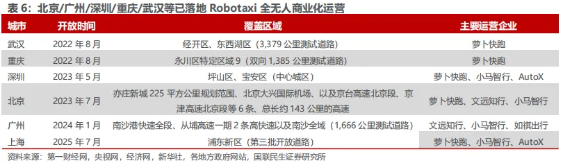 北京/广州/深圳/重庆/武汉等已实现Robotaxi全无人商业化运营。武汉于2022年8月率先开放经开区全域测试,成为全国首批全无人试点城市;重庆同期在永川区启动商业化试点。深圳于2023年5月在中心城区开展全无人运营,北京则在同年7月开放亦庄经开区核心区,允许收费服务。广州于2024年1月成为首个实现远程载客许可的城市,覆盖南沙区全域及中心城区。上海紧随其后,于2025年7月在浦东新区发放首批“无驾驶人示范应用”牌照。