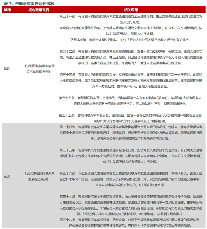 各地方政策鼓励Robotaxi落地,事故划分进一步明确。从深圳、武汉、北京、上海等地的智能网联汽车管理条例可以看出,各地正通过立法为自动驾驶商业化运营提供制度保障,尤其在事故责任认定和处罚规则上进行了细化规定,为自动驾驶技术的规模化应用奠定了法律基础。