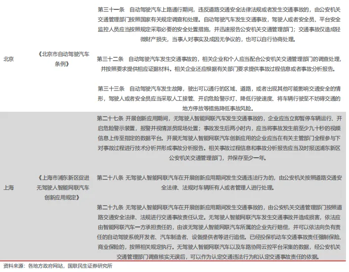 特斯拉以纯视觉方案入局,有望驱动硬件成本进一步降低。特斯拉在自动驾驶领域坚持采用纯视觉方案,摒弃了成本高昂的激光雷达,有望显著降低硬件成本,这为其全球化规模化运营提供了优势。根据盖世具身智能,2025年6月22日特斯拉Robotaxi在美国德克萨斯奥斯汀市开启试运营,首批35辆配备纯视觉感知和FSD V12系统的测试车辆,以4.2美元/次的固定价格面向特定群体开放试乘服务。2025年8月7日马斯克宣布Robotaxi已经在旧金山湾开始运营,覆盖范围从北部的马林县和伯克利,一直到南部的圣何塞,东西方向则涵盖旧金山湾区沿岸的主要城市。特斯拉计划在2025年内推出约1,000台Robotaxi,2026年预计生产1万辆Robotaxi,实现大规模落地。未来特斯拉计划保有部分车队的同时,也将开放一部分给私人车主参加。同时积极部署全自动驾驶(FSD),预计2025年底在美国多个城市部署,2026年扩展至更多国家。2.3 政策端:全无人商业化逐步落地 事故责任划分不断明确