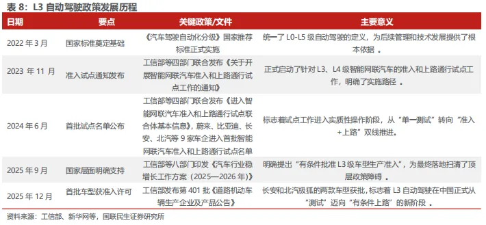 首批L3级有条件自动驾驶车型准入许可落地,规模化应用有望加速。2025年12月15日,工信部正式公布我国首批L3级有条件自动驾驶车型准入许可,两款分别适配城市拥堵、高速路段的车型将在北京、重庆指定区域开展上路试点,标志着我国L3级自动驾驶从测试阶段迈入商业化应用的关键一步。两款车型分别来自长安和北汽旗下,将分别由重庆长安车联科技有限公司、北京出行汽车服务有限公司两家使用主体在上述限定区域内开展上路通行试点。试点阶段功能仅在申报地政府批准的具体高速及快速路段可用,未来将通过OTA持续扩展可用的道路和区域。