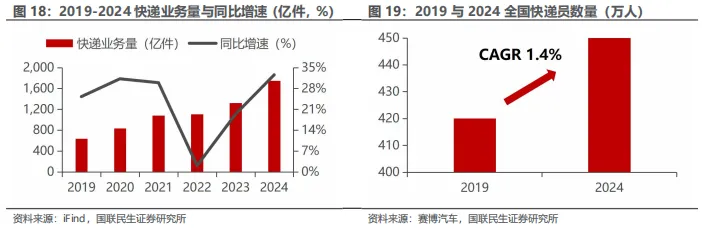 末端配送占物流总成本60%,无人化需求强烈。作为物流体系中最依赖人力、效率提升难度最大的环节,末端配送已成为压缩行业利润、制约规模扩张的关键瓶颈。2019至2024年,全国快递业务量从635.2亿件激增至1,750.8亿件,年均复合增长率达22.5%,展现出极强的增长韧性和消费驱动。然而,同期快递员数量仅由420万人增至450万人,CAGR仅1.4%,远低于业务增速,造成快递员人均派件压力持续上升,2024年日均派送量已突破100件。在用工成本上升、劳动强度加剧与人力资源吸引力下降的多重压力下,传统人工模式难以为继。无人配送作为关键替代方案,具备全天候、高频次、低成本运行能力,能够在快递、外卖、零售等高频应用场景中有效填补人力缺口、降低履约成本、提升服务稳定性。随着技术成熟、政策支持加强与示范落地推进,末端配送无人化正从探索阶段加速迈入规模化应用期,需求端具备清晰的结构性增长逻辑与长期放量潜力。