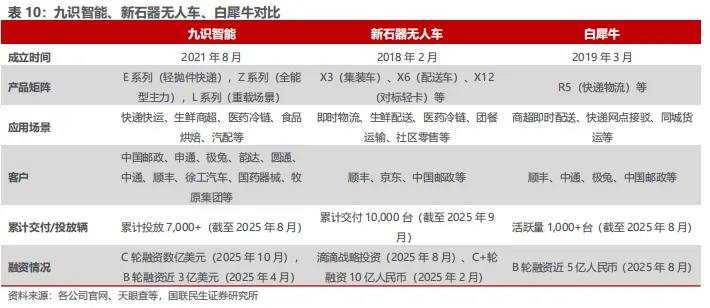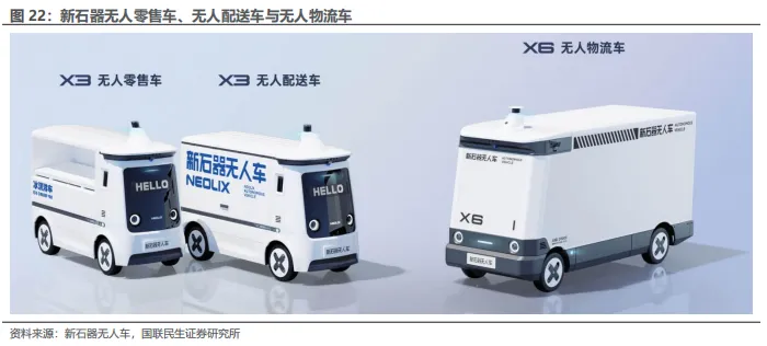 2)Robovan是专注于末端物流的无人货运车,服务于快递、商超等最后五公里物流需求,头部厂商主要有新石器、九识、白犀牛等;