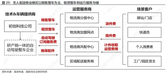 无人配送商业模式以整车销售为主,租赁整车与运力服务为辅,供给体系日益走向系统化与服务化。在供给链上游,初创科技企业不再局限于单点硬件输出,而是逐步演化为集自动驾驶系统研发、整车/机设计制造与售后服务于一体的综合技术提供商,通过销售或租赁车辆,并叠加FSD订阅、维保支持等服务,实现“产品+服务”的协同变现模式。中游运营环节呈现出多元主体并存格局,包括物流商分拨中心、加盟网点、共配中心及区域配送服务商等,其核心职能是承接整车/运力资源并完成本地化配送执行,主要通过派件、揽件或计件方式收取运营费用,构建稳定收益模型。该运营层的存在显著增强了车辆供给与终端场景之间的衔接能力,是支撑无人配送在不同场景高效落地的关键一环。整体来看,供给端已由单一的硬件输出模式,演进为涵盖技术系统、整车能力、运营网络的纵向整合架构,为Robovan等具备系统集成与运营协同能力的企业提供了良好的落地基础和生态空间。