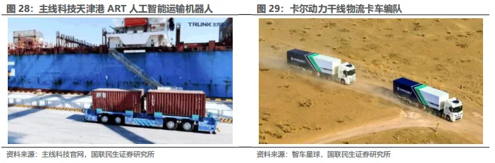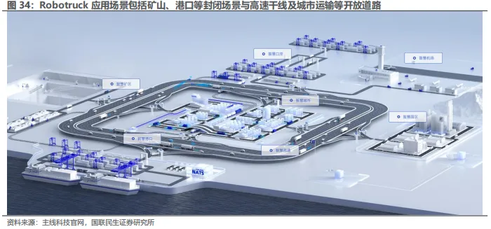 3)Robotruck是面向中长途货运的自动驾驶卡车,主要应用于港口、矿区及干线物流场景,头部厂商包括小马智行、智加科技、嬴彻科技等;