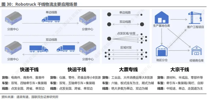 3)大票专线:大票专线聚焦工业品及大件消费品等B类货源,货物单票重量大、装卸频率低,通常采用大轴或板式挂车运输,线路多数为单边直发,Robotruck在此类高负载、低频次、结构化强的场景中具备良好的替代潜力;