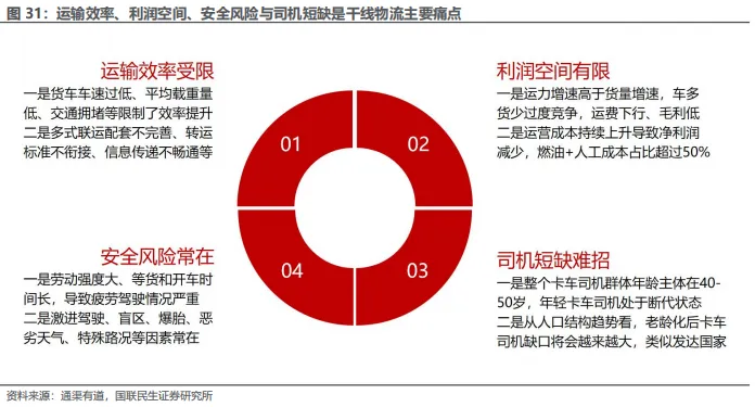 运输效率、利润空间、安全风险与司机短缺是干线物流主要痛点。