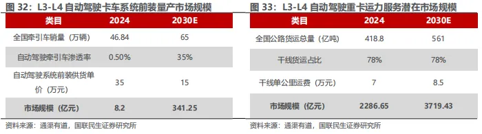 Robotruck应用场景包括封闭场景/干线物流两类,市场规模有望达千亿级。封闭场景凭借道路结构清晰、交通参与者单一等优势,成为L4级自动驾驶的初步验证基地,实现全天候高强度作业;而干线物流虽道路环境复杂,但货运需求稳定、运营价值更高,是商业化落地的核心方向。行业痛点突出:运输效率受限于车速低、载重率不足及交通拥堵,导致时效难提升;利润空间被运价下行挤压,燃油与人工成本占比超50%,毛利率普遍偏低;安全风险因司机超时驾驶和极端天气加剧,年轻司机供给断层,事故率居高不下。市场规模方面,预计2030年L3-L4自动驾驶卡车前装市场规模达341亿元,运力服务市场更将突破3719亿元。