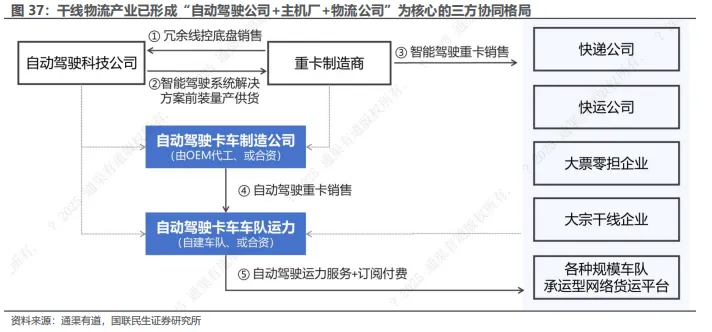 干线物流产业已形成“自动驾驶公司+主机厂+物流公司”为核心的三方协同格局。在该体系中,自动驾驶公司作为核心技术提供方,专注于冗余线控底盘、自研感知决策系统及整车自动驾驶解决方案的研发与前装量产供货,同时通过销售L2-L4级智能驾驶重卡、提供运力服务或订阅付费等模式实现商业闭环;主机厂则通过OEM或合资形式参与智能卡车制造,推动自动驾驶系统在量产车型中的原生嵌入,降低成本并提升交付能力;物流公司掌握场景、货源与网络资源,参与实际运输网络的搭建与运营,验证自动驾驶系统在真实业务中的效率与稳定性。该协作机制不仅覆盖从底盘到系统、从整车到运力的完整价值链,还通过前装量产、定制化合作、服务分发等方式向快运、专线、大宗、车队及平台类客户全面渗透,构建起技术输出与运力变现并行的双轮驱动模式。随着规模化部署临近,三方协同正在成为推动干线物流自动驾驶商业化落地的主流路径。