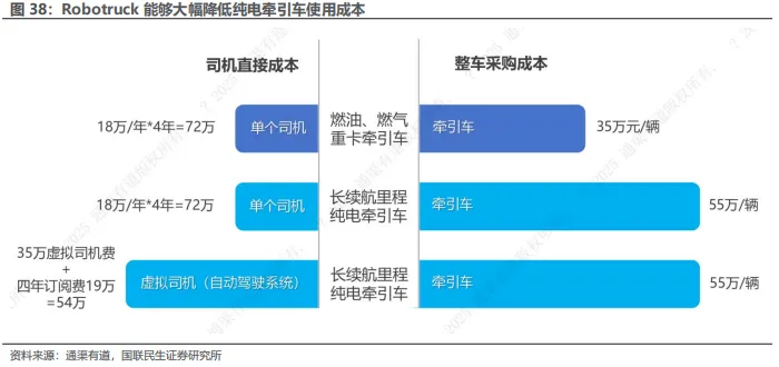 需求端,Robotruck应用场景主要包括港口/矿区等封闭场景、干线物流两类,前装与运力服务市场规模有望达千亿级。供给端,封闭场景率先实现L4落地,验证全天候高强度作业能力。干线物流虽环境复杂,但货运需求稳定、运营价值高,是商业化核心方向,正从示范验证走向小规模运营,聚焦跑通盈利模型。Robotruck通过采用“虚拟司机”,能够大幅降低纯电牵引车使用成本。政策端,国家支持明确,但因重卡事故风险高,地方开放态度审慎,“车路云一体化”试点有望加速跨省市协同。