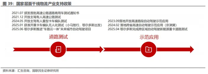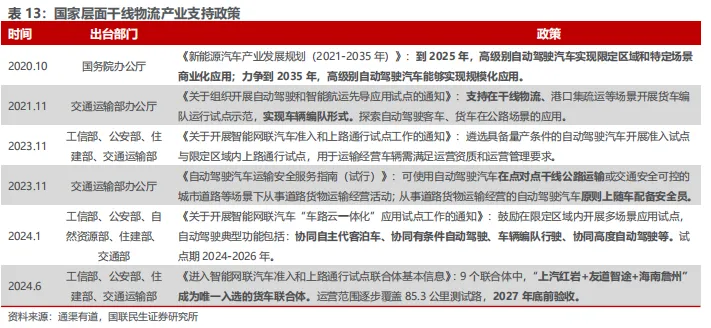国家支持干线物流点对点运输,安全员是目前必须配置。在政策层面,自2020年以来,国家相关部委密集发布文件,持续推动自动驾驶在干线物流领域的落地与规范。2020年10月,国务院办公厅印发《新能源汽车产业发展规划(2021-2035年)》,明确提出到2025年,高级别自动驾驶将在限定区域和特定场景实现商业化应用,2035年实现规模化应用。2021年11月,交通运输部发布《关于组织开展自动驾驶和智能航运先导应用试点的通知》,首次明确支持在干线物流、港口集疏运等场景中开展货车编队运行试点。进入2023年,政策进一步向运营合规与安全管理过渡。2023年11月,交通运输部出台《自动驾驶汽车运输安全服务指南(试行)》,提出自动驾驶汽车可在干线公路或可控城市道路开展货运经营,但需配备安全员。同期,工业和信息化部、公安部、交通运输部、住房和城乡建设部联合发布《关于开展智能网联汽车准入和上路通行试点工作的通知》,提出允许通过量产车参与准入试点,并对运输经营车辆提出运营资质及管理要求。2024年1月,工业和信息化部等五部委进一步印发《智能网联汽车“车路云一体化”应用试点通知》,明确将车辆编队行驶、高度自动驾驶等列为2024—2026年重点试点场景。2024年6月,四部委联合发布《智能网联汽车准入和上路通行试点联合体基本信息》,公布首批入选项目名单,干线货运领域仅“上汽红岩+友道智途+海南儋州”联合体入选,目标是在2027年底前完成85.3公里测试道路建设及验收。整体来看,国家政策正由鼓励创新逐步转向体系化、规范化支持,构建起从准入试点到商业运营的闭环机制,为未来取消安全员配置、实现规模化无人化干线运输奠定制度基础。