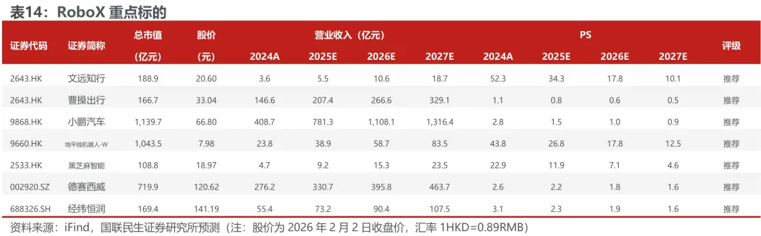 RoboX产业化加速推进:政策端驱动强劲,国家层面支持措施为规模化落地奠定制度基础;需求端源于降本增效的迫切需求驱动,显著降低运营成本。供给端技术突破显著,核心硬件成本持续下降,推动规模化落地。RoboX正从技术验证迈向商业闭环,预计2026-2027年渗透率快速提升,释放千亿级市场潜力。我们认为,自动驾驶解决方案商与运营商将直接受益于RoboX的规模化商用,盈利模型拐点已现,推荐【文远知行、曹操出行、小鹏汽车】,建议关注【千里科技】;另外,智能化零部件公司也将具备一定业绩弹性,推荐【地平线机器人、伯特利、德赛西威、经纬恒润、黑芝麻智能】,建议关注【瑞立科密、知行科技】。► 风险提示