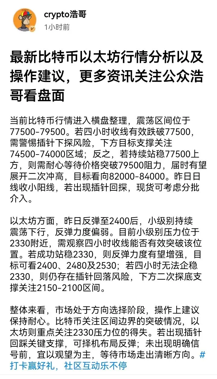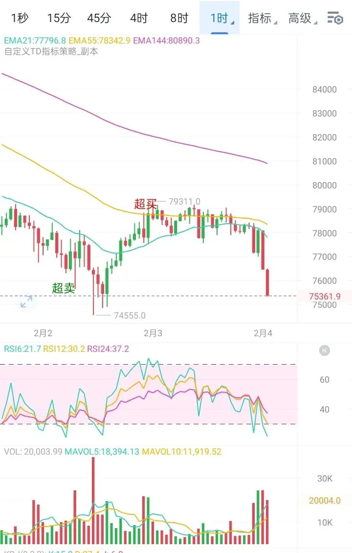 昨夜行情明确转空,大饼如期跌破76000关键关口,我们直播中给出的76800现价空单已成功抵达76000目标止盈。目前价格正进一步下探测试75000支撑,以太也同步弱势,向2200整数关口逼近。