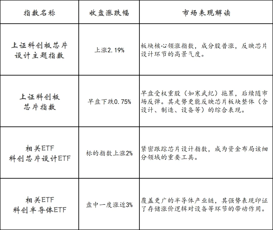 个股表现与行业景气度高度相关,存储与设计领涨,部分AI芯片领跌。