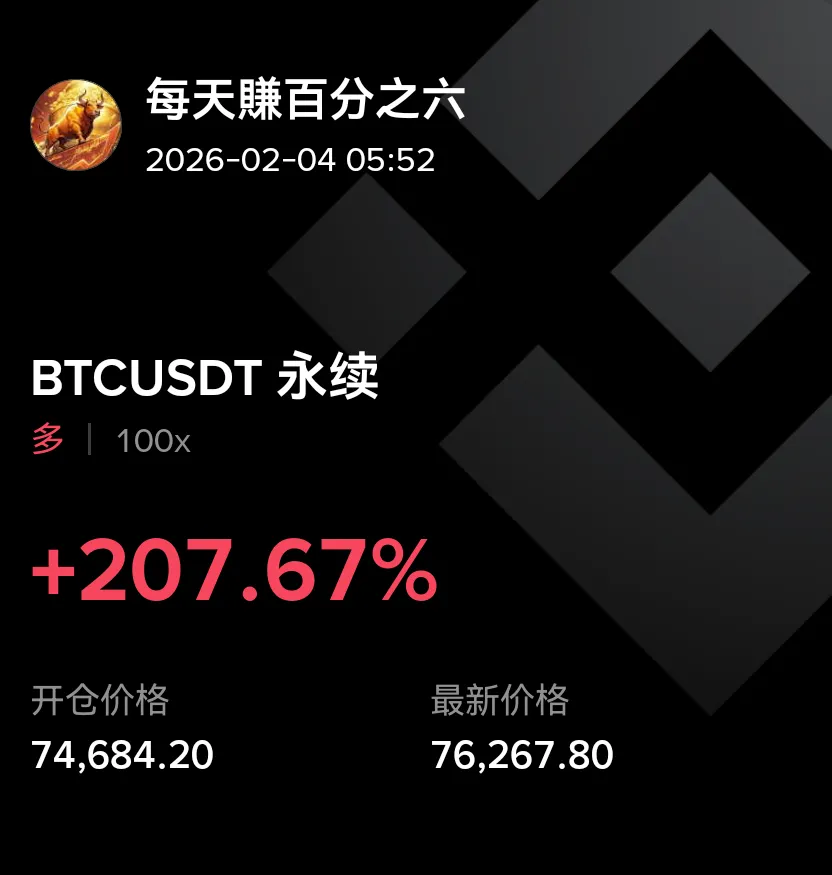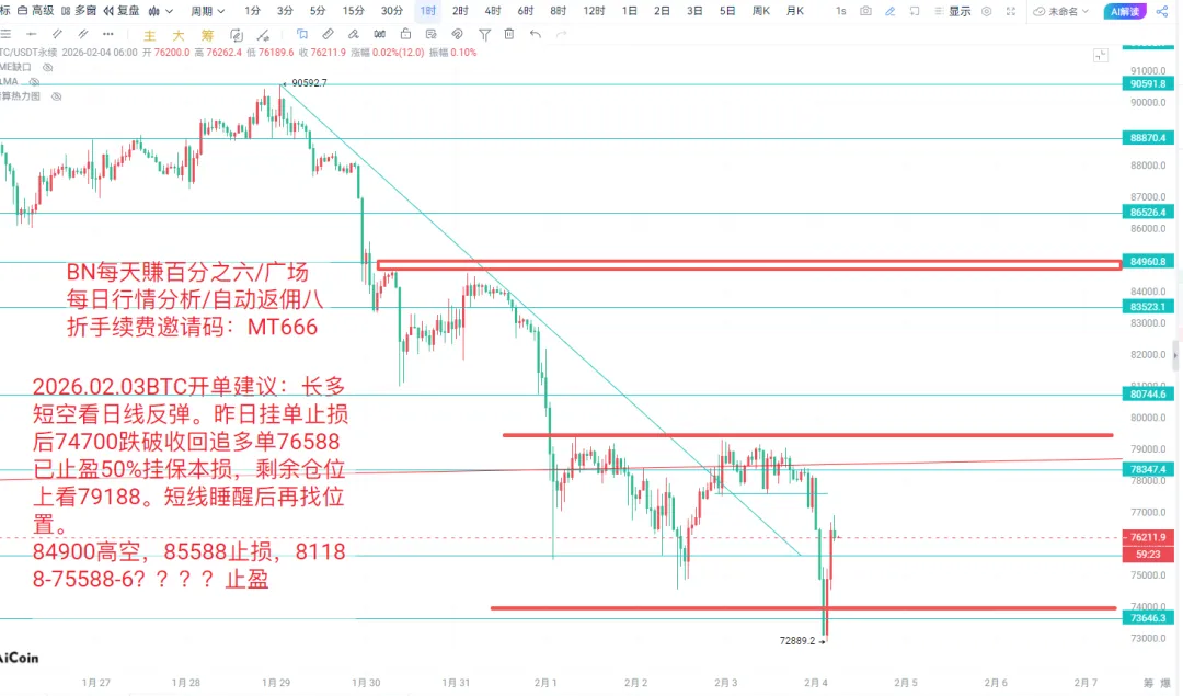 BTC凌晨假跌破74500的支撑打出了自25年以来的新低--72889,在重新站稳74500后选择了右侧重新做多,刚刚在76588止盈了50%后做出成本防守,目前价格在76000。这里先暂时不提供短线挂单策略,等睡醒后根据行情再做决定。行情方面,虽然今日凌晨出现了新的低点,但是近期我依旧看会走出一段日线反弹(除非BTC价格先跌破70888),所以我的思路还是长多短空,今日白盘重点位置在75588,如果今日四小时能够站稳75588,白盘的朋友可以选择做一个多单,目标上看77588-79188。目前上方79388存在压力,但是不建议再次在这里做空,下方的重要支撑在70888,这里是2024年全年行情的高点压制,如果你质疑现在是2026年为什么还要关注2024的压制,那么请你看三日线或者周线74500的位置。至于这一波行情反弹的高点,我还是坚持昨日的分析在84700,由于上方84900存在流动性聚集,所以我会选择84900挂一个中长线空单,止盈位置分别对应80888-74500等重要支撑阻力位,在81188-75588以及更低的低点。