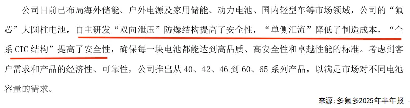 现在多氟多已经形成了全系列大圆柱电池产品矩阵,在续航300公里左右的新能源汽车和家用储能市场占据了领先地位。他们的“氟芯”大圆柱电池配备了自主研发的“双向泄压”防爆结构和全系CTC结构,安全性更好,还通过“单侧汇流”降低了制造成本。