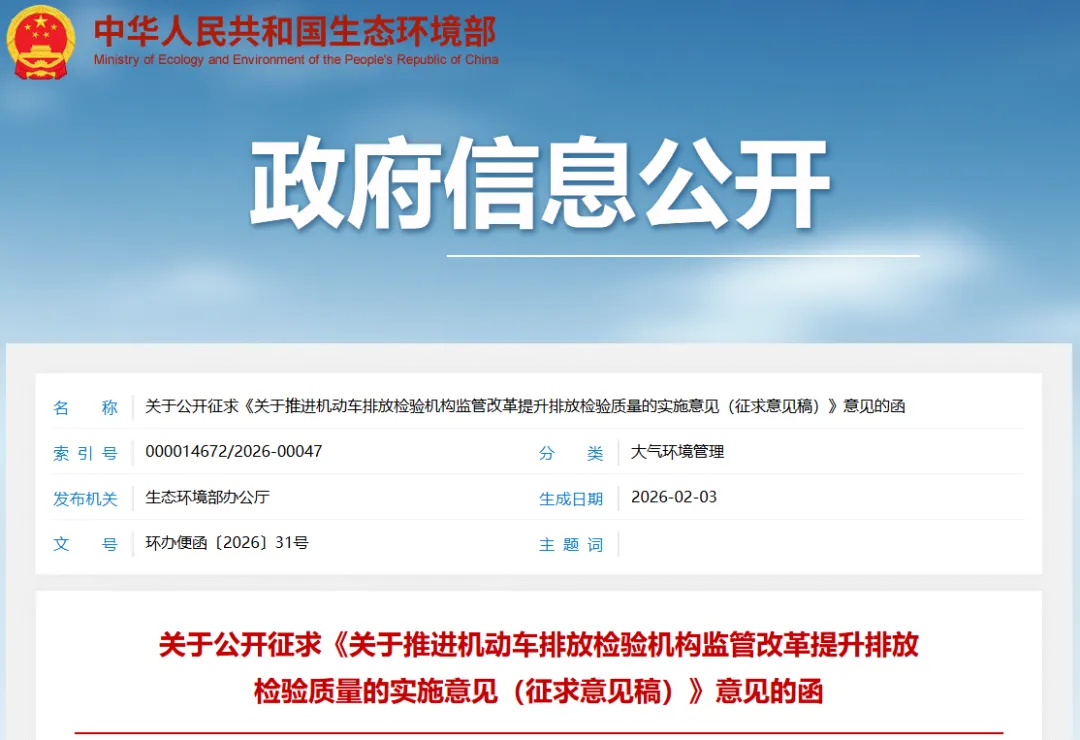 为进一步加强机动车排放检验机构监管,提升排放检验质量,减少机动车污染物排放,生态环境部会同市场监管总局组织编制了《关于推进机动车排放检验机构监管改革 提升排放检验质量的实施意见(征求意见稿)》,提出2026年年底前,市场监管总局、生态环境部联合建立国家级机动车排放检验机构资质评审专家库,并在国家机动车环境监管平台上公示,各地现场评审时可选择国家级专家。