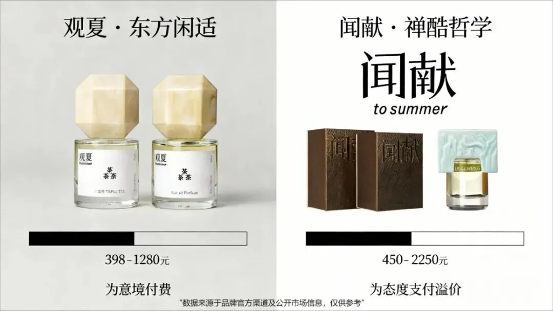 2.本土高端的东方品牌,像观夏、闻献就是代表:以独特的东方哲学当作“心境”的核心,走不一样的竞争路子。它们去争夺“东方美学”的当下定义权,吸引那些对文化身份和精神归属有很强烈需求的新消费群体;