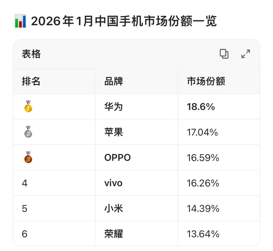 根据最新的 2026 年 1 月中国市场数据,华为强势拿下销冠,打破了苹果的垄断。