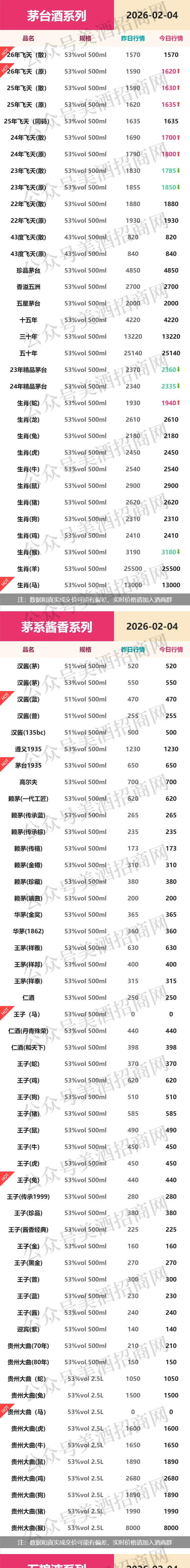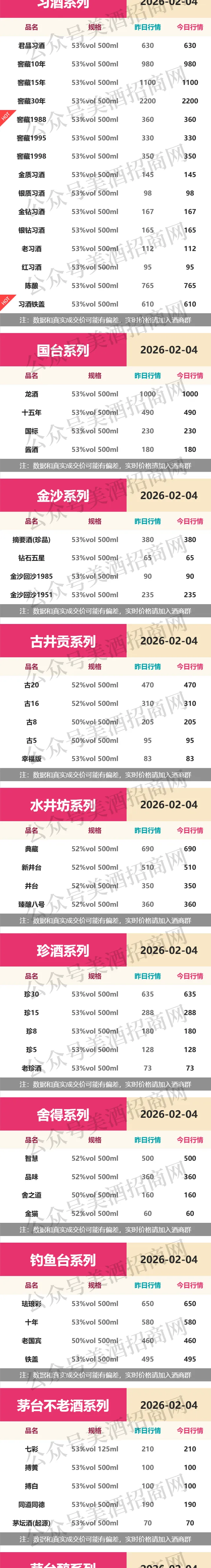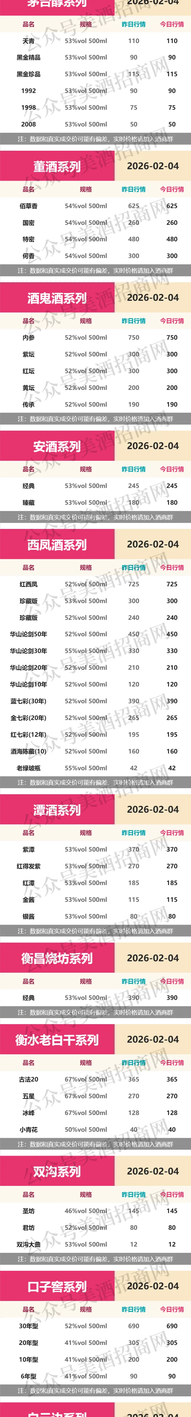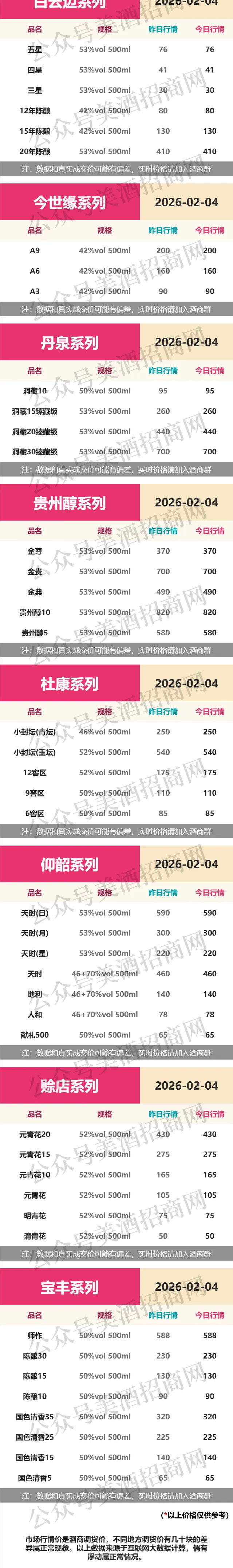 >2月4日各大名酒批发拿货参考价格!