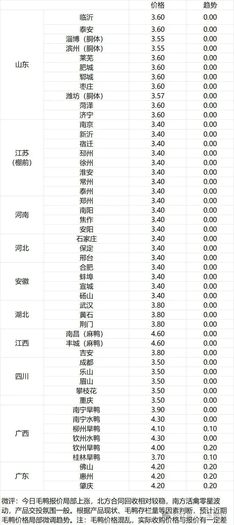 | 微评:鸭苗报价上涨。(注:南方只报当天价格)计划平稳,供需平衡。根据产品、养殖成本及鸭苗现状分析,预计近期鸭苗价格呈稳中微调趋势。种蛋报价涨5分。温馨提示:该价格为主流厂家报价,实际销售价格以成交价格为准,价格仅供参考。 |