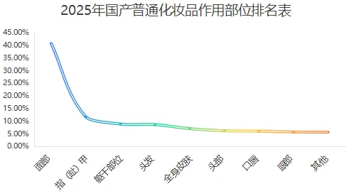 总体分析指出,2025年备案前十大作用部位的集中度极高,反映出品牌在备案选择上具有明显的市场导向性 。面部护理以接近41%的比例稳居榜首,这与中国消费者对“颜值中心主义”的长期认同高度一致。然而,排名第二的指(趾)甲类产品的异军突起,则是2025年最值得关注的产业变量之一。