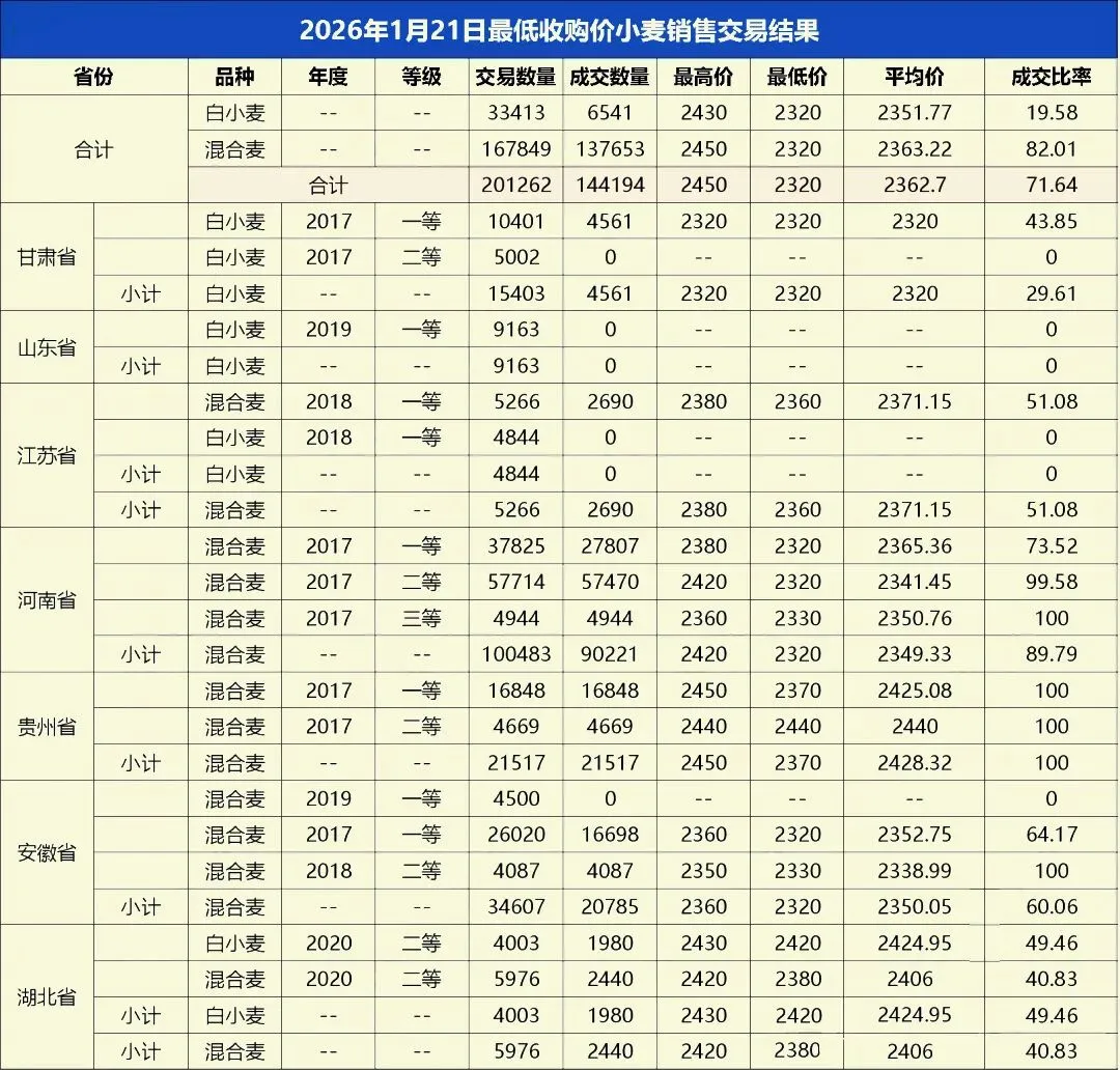 1月21日最低收购价小麦竞价销售结果出炉,计划投放201262吨,实际成交144194吨,成交率71.64%,成交均价 2362.7元/吨,区域成交走势分化显著,其中河南、安徽、贵州等主产区及西南销区成交率偏高,甘肃、山东、江苏、湖北则明显偏低。