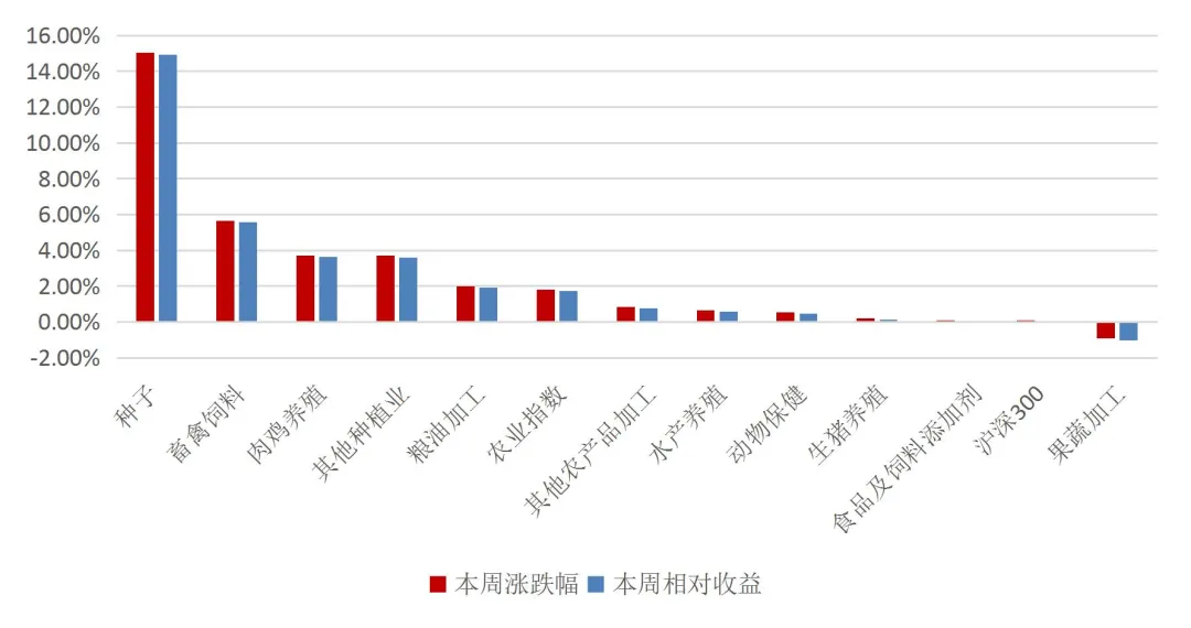 本周(1月26日-2月1日),沪深300指数涨跌幅为0.08%,农林牧渔板块涨跌幅为1.82%,板块排名第5;子行业中种子、畜禽饲料、肉鸡养殖、其他种植业、粮油加工表现位居前五。