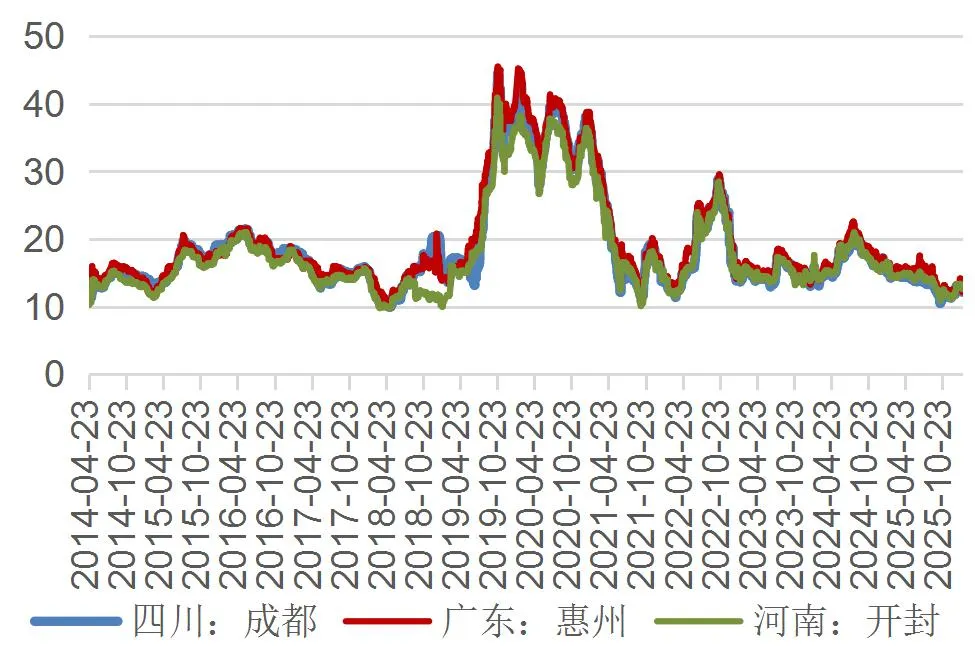 本周生猪价格环比下跌,猪肉均价微涨。截至1月30日,四川/广东/河南外三元生猪均价分别为12.15/12.16/12.63元/公斤,环比上周分别-5.08%/-9.66%/-4.54%;平均猪肉价格为18.61元/公斤,环比上周+0.65%;仔猪平均批发价格16.50元/公斤,环比上周持平。截至1月30日,自繁自养利润为25.10元/头,环比上周下滑18.25元/头;外购仔猪养殖利润为124.13元/头,环比上周增长8.29元/头。