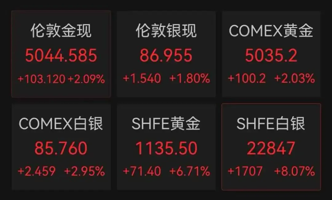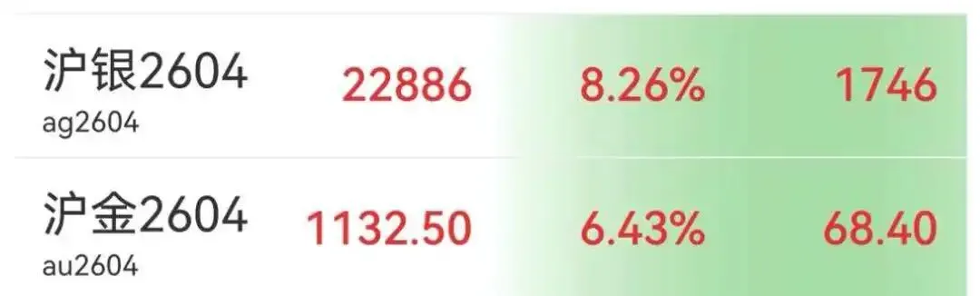 2月4日,国内商品期货早盘开盘,多数上涨。截至发稿,沪银期货主力合约大涨超8%,沪金期货主力合约涨超6%。