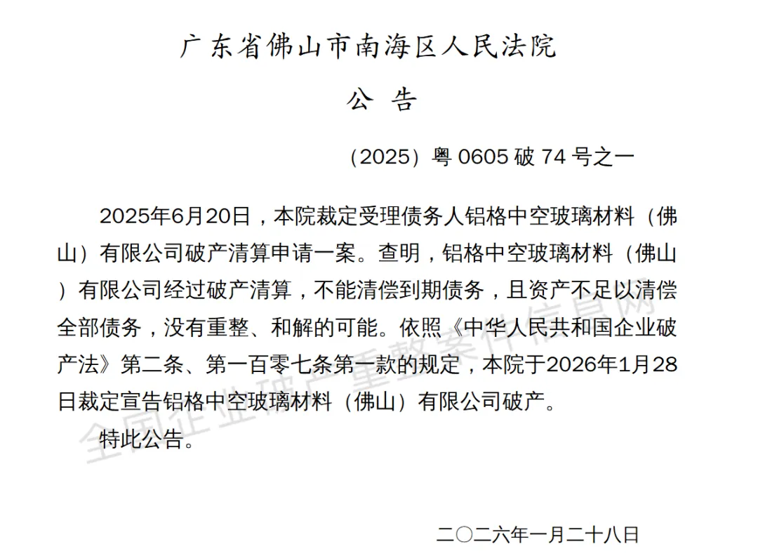 1月28日,佛山市南海区人民法院一纸裁定,宣告铝格中空玻璃材料(佛山)有限公司(以下简称“铝格公司”)正式破产。这家仅经营6年的建材企业,最终因资金链彻底断裂,黯然退出市场。从快速崛起到猝然倒下
