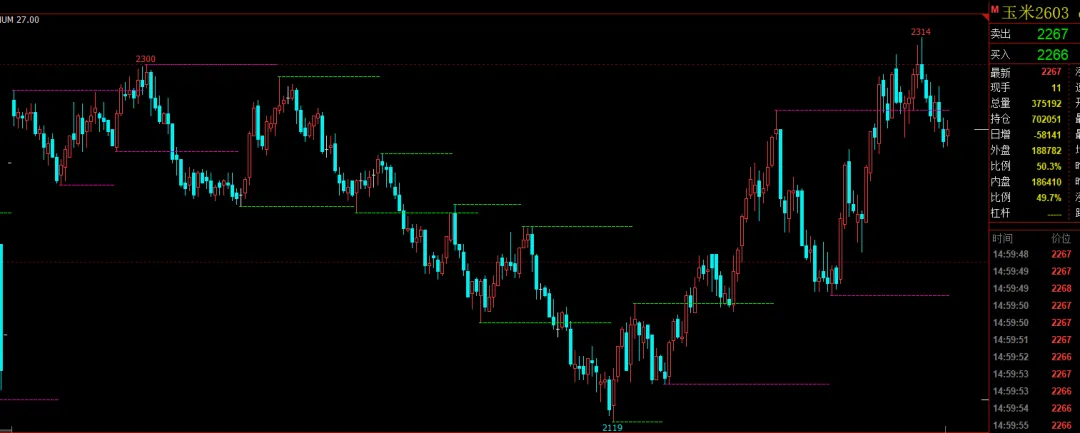 玉米期货夜盘下跌,其中3月合约最高2270,最低2254,收报2263,较上一交易日结算价下跌2元/吨,跌幅0.09%。