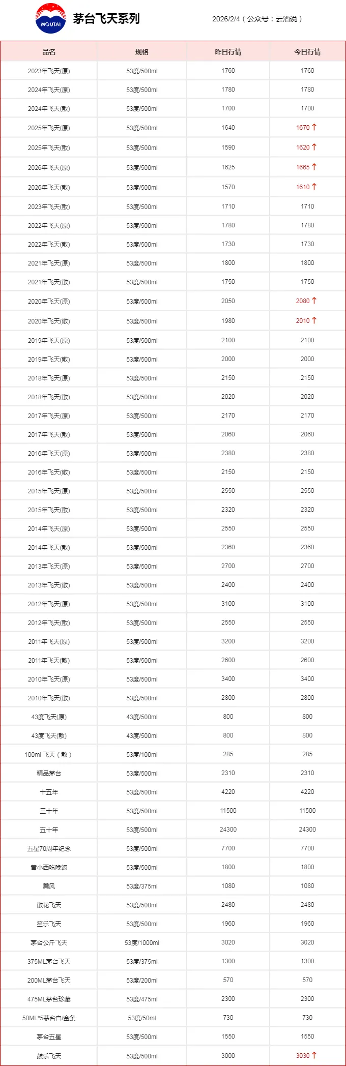 >2月4日,白酒茅台酒今日行情价格——继回调后茅台小幅度上涨