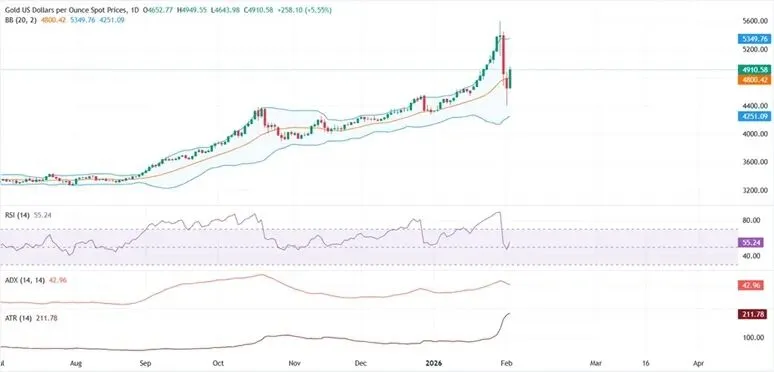 FXStreet分析师Vishal Chaturvedi指出,从技术角度来看,日线图上的整体上升趋势依然保持不变。黄金价格维持在20日简单移动平均线(SMA)上方,该均线也代表布林带中轨,位于4800美元/盎司附近。尽管上周从高点出现剧烈波动回调,但短期趋势结构仍然保持良好。