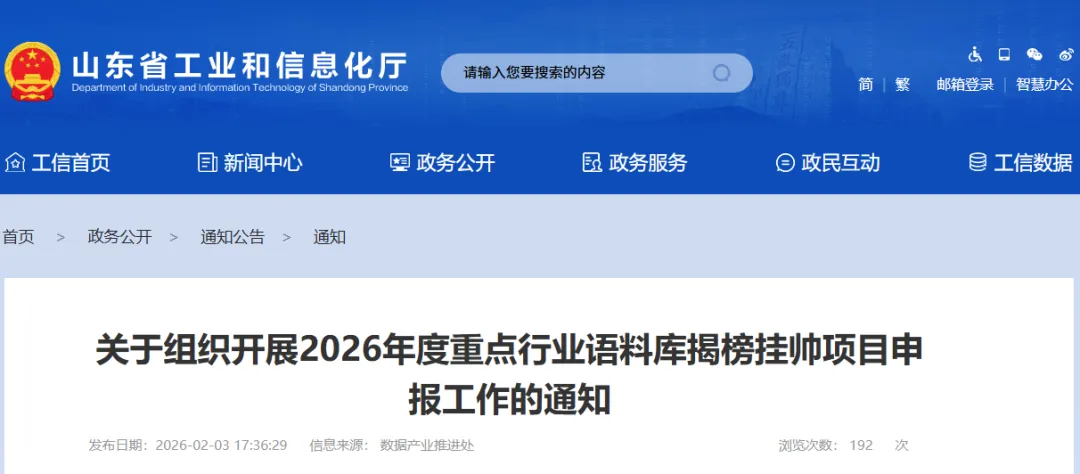 为深入贯彻全省“人工智能+”创新应用工作会议精神,认真落实《山东省人民政府办公厅印发〈关于支持人工智能全产业链创新发展的若干政策措施〉的通知》要求,加快打造一批高质量、标准化、可流通的行业语料库,赋能一批行业大模型、工业智能体等应用落地,根据《山东省省级“语料券”奖补资金管理办法及实施细则》,现组织开展2026年度重点行业语料库揭榜挂帅项目申报工作。有关事项通知如下:
