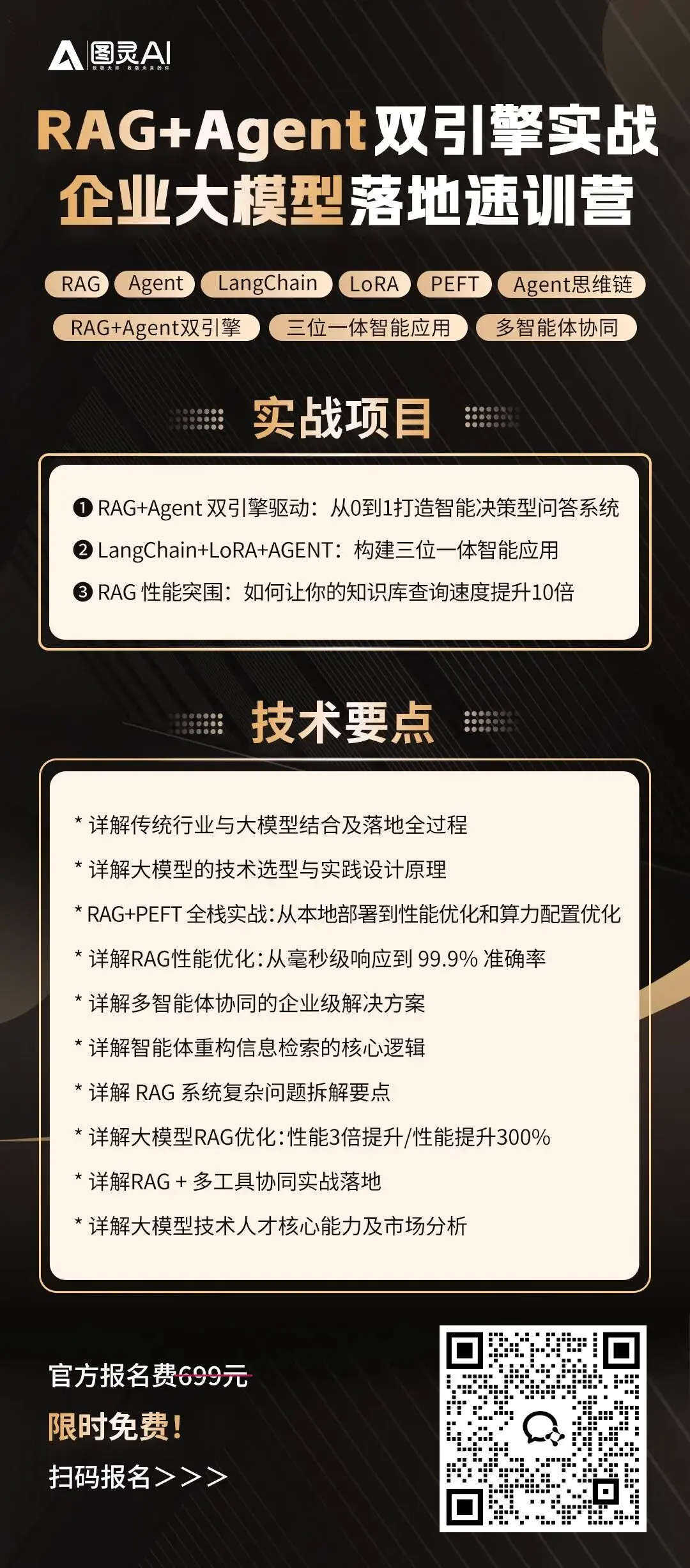 RAG:解决大模型输出不可靠的核心技术,通过外接知识库提升回答准确性,是企业级AI应用落地的必备能力;Agent:赋予大模型自主执行任务的能力,通过工具调用、任务分解实现复杂场景的自动化处理,是AI产品进阶的关键技能;LangChain:整合主流大模型接口的标准化框架,简化RAG与Agent的开发流程,大幅降低AI应用从原型到落地的技术门槛。今天我们特意准备免费的「AI大模型实战速训营」,系统讲解三者核心,从基础到实操拆解,由5年+行业大佬亲授,全程实战,零基础也能听懂,学完就能上手做项目。此次实战训练,是专为AI大模型而设计的,课程由顶尖名师的专业指导与规划,本次课程并不仅限于技术干货传授,更有技术大佬十余年积累的技术变现经验分享。