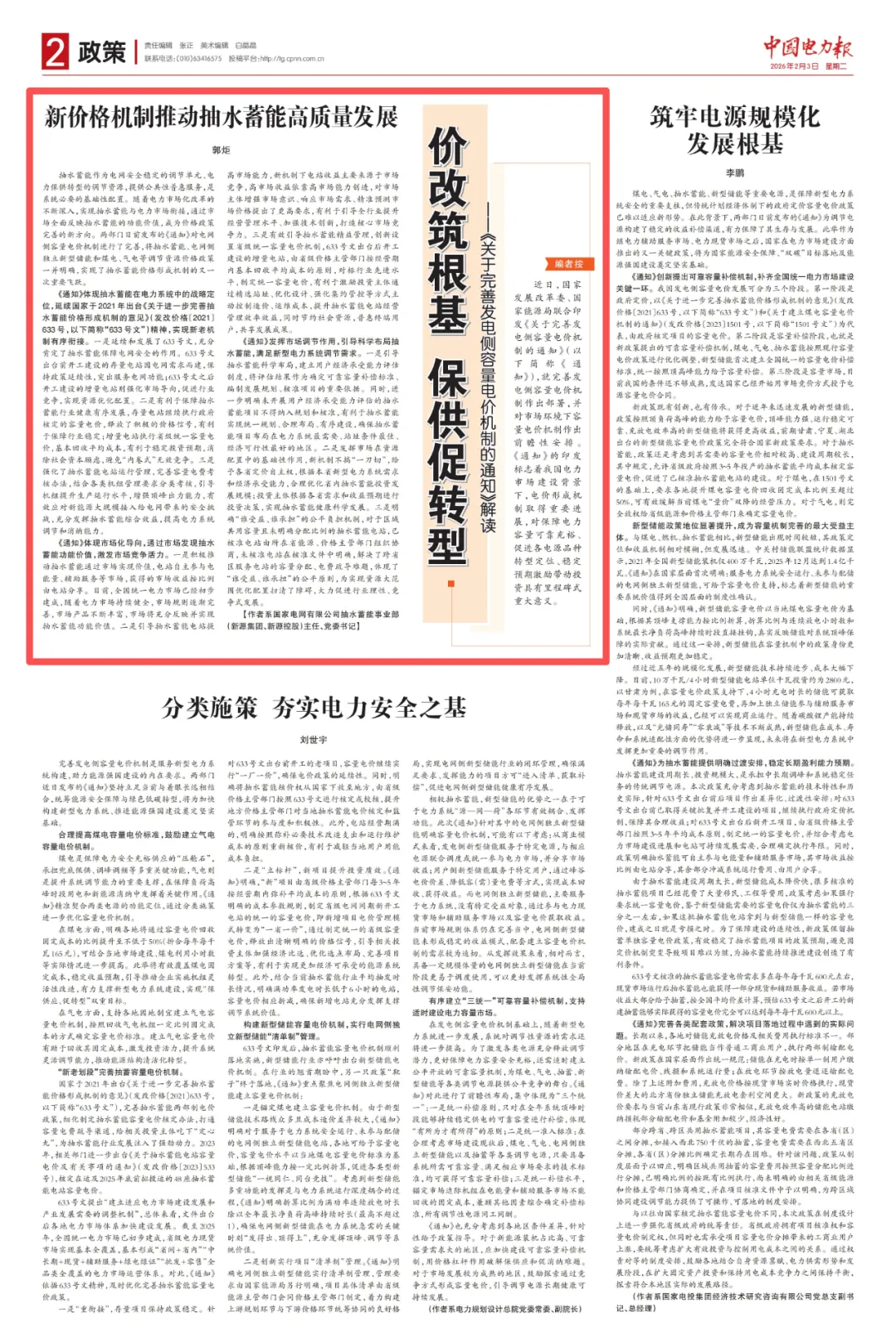 编者按: 2026年2月3日,《中国电力报》刊发国网抽蓄事业部(新源集团、新源控股)主任(董事长)、党委书记郭炬署名文章《新价格机制推动抽水蓄能高质量发展》。文章系统解读了国家发展改革委、国家能源局《关于完善发电侧容量电价机制的通知》(发改价格〔2026〕114号)(以下简称“通知”)的政策背景与深远影响,深刻阐述了抽蓄功能定位、市场化导向、科学布局等方面的核心要义,分析了其对引导调节性电源平稳有序建设、保障电力系统安全稳定运行、助力能源绿色低碳转型的重大意义。