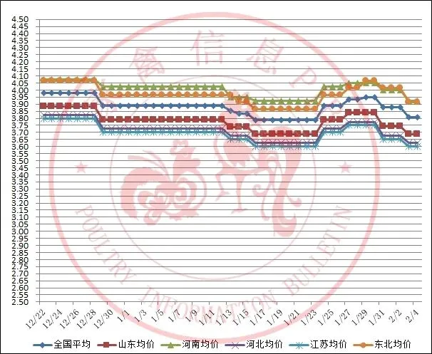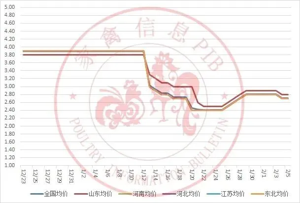 2025年12月23日-2026年2月5日主流地区白羽鸡鸡苗均价走势图